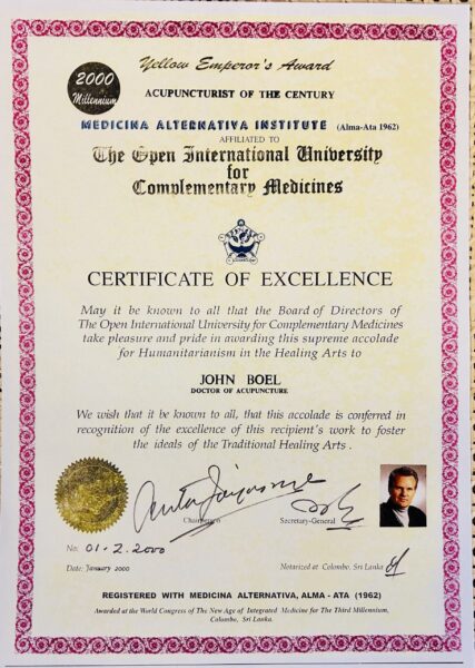 John Boel er udnævnt til Visiting Professor ved The Open International University for Complementary Medicine i Sri Lanka – og i år 2000 blev han hædret med titlen “Acupuncturist of the Century” (Århundredets Akupunktør).